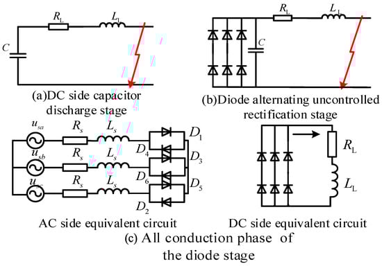 - Full diode conduction stage: When the capacitor discharges to zero, all diodes turn on due to the back electromotive force generated by the DC-side reactance, leading to a decrease in the DC-side short-circuit current. The AC side essentially experiences a three-phase short-circuit fault, resulting in a rapid overcurrent. The converter then faces the impact of short-circuit currents on both the DC and AC sides, transitioning the system to the fault steady-state stage. The equivalent model of the fault phase is shown in the Figure 8, where RL and LL represent the equivalent resistance and inductance of the DC line, and Rs and Ls represent the equivalent resistance and inductance of the AC line.