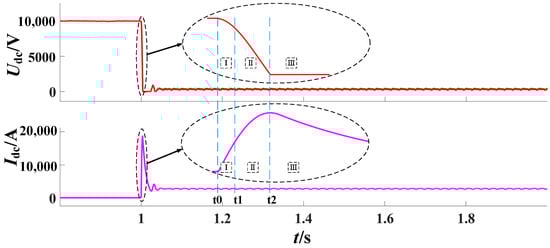 As shown in Figure 9, an interpole short-circuit fault is set in the DC line at t0. From t0 to t1, the DC-side capacitor discharges to the AC-side line voltage, and the current rises sharply, which is the first stage. From t1 to t2, the capacitor voltage drops to 0 and the short-circuit current continues to rise to the peak value (about 18 kA), which is the second stage of the fault. The first stage and second stage last about 3~4 ms. After t2, an RL first-order discharge circuit is formed, the short-circuit reactance is discharged through a freewheeling diode, and the fault current continues to decay to steady state, which is the third stage of fault.