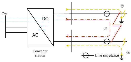 When a short-circuit fault occurs on the DC side, the direction of the fault current in the DC-side line of any end converter is illustrated in Figure 11. Regardless of whether it is an interpole short-circuit fault or a unipolar ground fault, the fault pole current exhibits the following characteristics: if the positive pole line is the fault pole, the fault current flows from the bus to the line; if the negative pole line is the fault pole, the fault current flows from the line to the bus.