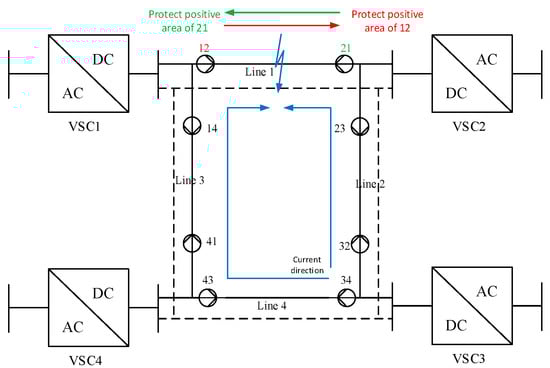 Considering the cost-effectiveness of optical access in directional longitudinal protection, directional overcurrent protection is installed only on the positive pole of the DC side line. As illustrated in Figure 12, when an interpole short-circuit fault occurs on line 1, both Protection 12 and Protection 21 detect a positive pole overcurrent and transmit this signal to the opposite end via optical fiber. Due to the positive equivalence of the signals, it can be determined that the fault is located between converter station 1 and converter station 2, indicating an in-zone fault. Meanwhile, Protection 32, Protection 34, and Protection 41 also detect positive overcurrent, but they do not activate at their respective ends, and their optical signals do not match, indicating an out-of-zone fault. Once both in-zone and out-of-zone faults are identified, the circuit breaker operates to clear the fault in accordance with the current limiter protection principle.