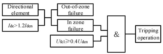 Thus, the positive direction for directional overcurrent protection in the positive pole lines is from bus to line, while for the negative pole lines, it is from line to bus. In the event of a unipolar grounding fault, only the directional overcurrent protection for the affected pole is triggered. Conversely, when an interpole short-circuit fault occurs, both levels of directional overcurrent protection are activated, allowing for the identification of the fault type and the specific pole where the failure occurred []. Based on this, a directional longitudinal protection strategy is established, as shown in the following figure.