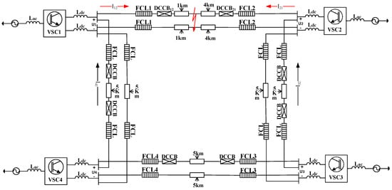 A simulation model of the DC distribution network is built using MATLAB/SIMULINK R2018b, with all four-terminal converter stations employing VSC topology. New flexible current limiters are installed only at the initial end of each pole line. The DC line impedance is set to r0 = 0.015 Ω/km and L0 = 0.1 mH/km. Other system structure and operation parameters are provided in Figure 15 and Table 1. An interpole short-circuit fault is introduced at the outlet of converter station 1 at 0.5 s. Based on this simulation model, the protection strategy proposed in this paper is analyzed and verified.