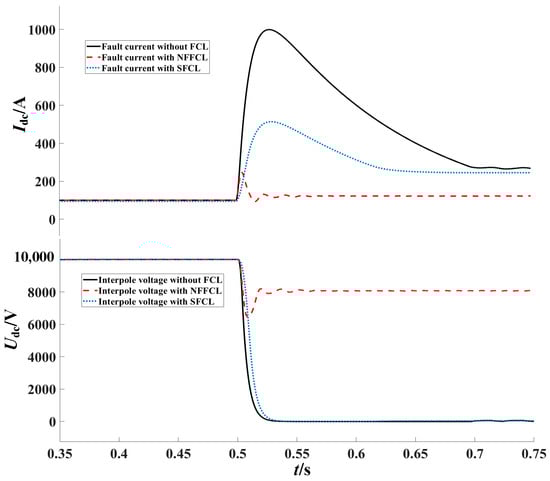 This subsection simulates the fault state on one side of the converter station. An interpole short-circuit fault is introduced 1 km from the outlet of the converter station at 0.5 s. Upon detecting the fault signal, the flexible current limiter operates for 0.5 s. Additionally, an inductive superconducting current limiter is included separately to compare its effectiveness with that of the new current limiter. The simulation results are shown in Figure 16.