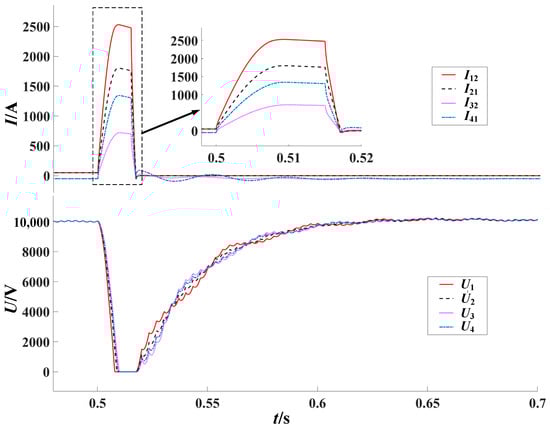The interpole short-circuit fault occurs at 0.5 s. The VSC1 and VSC2 are near the fault end. The interpole voltage drops to 0 V within 8 ms, and the fault currents I12 and I21 reach their peak values, both exceeding 1.7 kA. The bridge arm current of the converter station exceeds the self-protection threshold (3–5 times the rated current) within 2 ms and is blocked. When the interpole voltage drops to 0 V, the fault current begins to decrease. Other converter stations are away from the fault, so the fault current rises slowly and the amplitude is relatively small. I32 and I41 rise from −50 A to 0.6 kA and 1.3 kA after the short-circuit. At 3 ms after the fault occurs, the directional longitudinal protection monitors the fault signal in the zone to send out the braking instructions to DCCB12 and DCCB21. The mechanical switch brakes and burns the arc, and the transfer branch is put into operation to produce resonance zero crossing. At 15 ms after the fault occurs, the energy-consuming branch conducts and discharges energy. The voltage of each port restores to its rated state after the impact, and the fault current decreases accordingly. After the transient fluctuation, I12 and I21 disappear. I32 and I41 resume rated operating conditions. The time of the whole breaking process exceeds 18 ms.