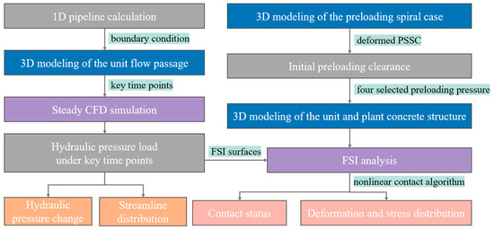 Since numerical methods can provide a more detailed representation of contact status and response behaviors compared to experiments, most research on the PSSC is performed by CFD and FEM methods. To simulate the initial preloading clearance, simplified methods were first introduced, in which the contact status was determined by judging the preloading pressure value with hydraulic pressure only [25,26]. It has been proven that this method is unreliable for safety assessments due to its over-simplification and tendency to underestimate stress values [22]. More methods focusing on the nonlinear contact behavior were proposed by modifying the grid node coordinates or contact element types. Li et al. [27] and Qian et al. [28] studied the bearing ratio and contact behaviors between the spiral case and concrete under different preloading pressures. Xu et al. [29] characterized the premature and delayed closure phenomena of the preloading clearance. Fu et al. [21] revealed that the structural responses were strongly determined by clearance closing characteristics. However, the simulation methods of modifying grid node coordinates in these studies may cause node penetration and stress concentration, and contact element types need complex procedures that fail to fully satisfy the simulation requirements [20]. As a contact algorithm with good stability and convergence, the augmented Lagrange method has been proven effective in studying the contact behavior between the spiral case and concrete [19,29]. To analyze the structural characteristics of the PSSC under operational conditions, some papers [30,31,32] applied a static load as hydraulic pressure on the PSSC without considering the effects of pressure variation in the flow domain. Some other researchers [33,34] introduced harmonic waves into the structural model for the simulation of hydraulic pressure. However, these simulation methods for hydraulic pressure fail to capture the pressure fluctuation characteristics present in the actual flow domain, which can significantly affect the accuracy of simulating flow-induced responses. Research on the flow-induced structural response of the PSSC during load rejection is critical for optimal preloading pressure selection and structural design. As far as the authors know, there is a lack of published studies that consider the combined effect of preloading pressure and hydrodynamic excitation during load rejection.