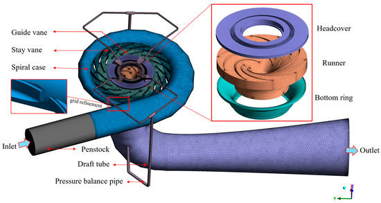 The 3D modeling of the fluid domain in Figure 2 consists of a spiral case, a runner, guide vanes, stay vanes, a draft tube and two pressure balance pipes. The headcover and bottom ring, as the clearances in the fluid domain, are less than 1.9 mm, but they have a significant impact on the flow characteristics. There is a penstock setting in front of the spiral case for minimizing numerical errors of the spiral case pressure distribution, influenced by the inlet boundary condition. For the calculation of a high-Reynolds-number flow, the shear stress transport (SST) k-ω model is selected as the turbulence model to solve the N-S equation with a convergence criterion of 10−4 based on ANSYS CFX 2021. According to the calculation results from the 1D pipeline simulation, the total pressure type for the inlet and the static pressure type for the outlet are applied to the boundary conditions at the key time points. The surfaces of the headcover and bottom ring that are in contact with the runner domain remain stationary relative to it, so they are set as Rotating Walls, with the rotational speed set to the rated value. The rotor–stator interfaces between the runner and guide vanes, as well as between the runner and draft tube, are configured with the Frozen Rotor method. The wall boundary condition is set as a non-slip wall.