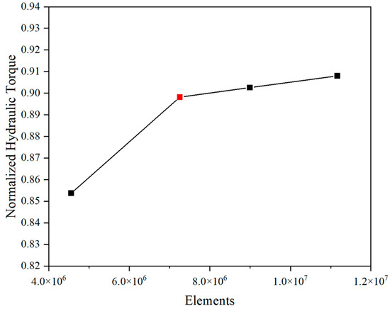 To ensure that the mesh quality meets the needs of both calculation accuracy and efficiency, a mesh independence analysis was carried out by comparing the normalized hydraulic torque using different mesh numbers. Four sets of meshes were established in ANSYS MESH 2021 to calculate the steady state at the key time point of load rejection when the spiral case is at the maximum pressure, and a mesh with 7,253,227 elements was adopted for the load rejection calculation, as shown in Figure 3. The mesh element types and the number of different flow domains are shown in Table 1 in detail.