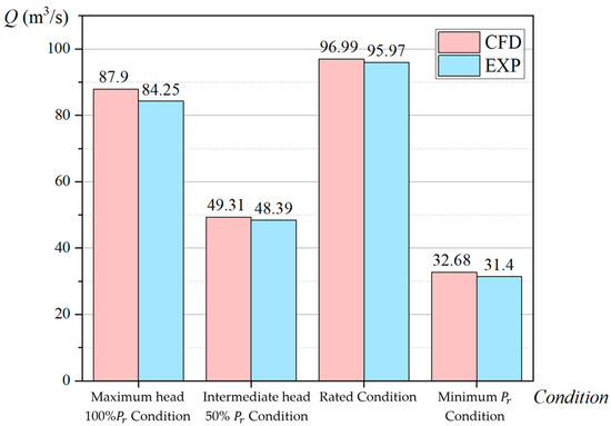 To verify the accuracy of the CFD model simulation, the simulation results under four different conditions were compared with experimental data provided by the manufacturer. The conditions include the maximum head 100% , intermediate head 50% , and rated and minimum conditions. The calculation errors of the pressure fluctuation in the vaneless space are less than 5.37% (Table 2). Since the inlet and outlet are set as the boundary conditions of pressure, the calculated flow rate from the numerical simulation is compared with experimental data, showing good agreement, as shown in Figure 4. These validations confirm the reliability and credibility of the numerical methods used in this paper.