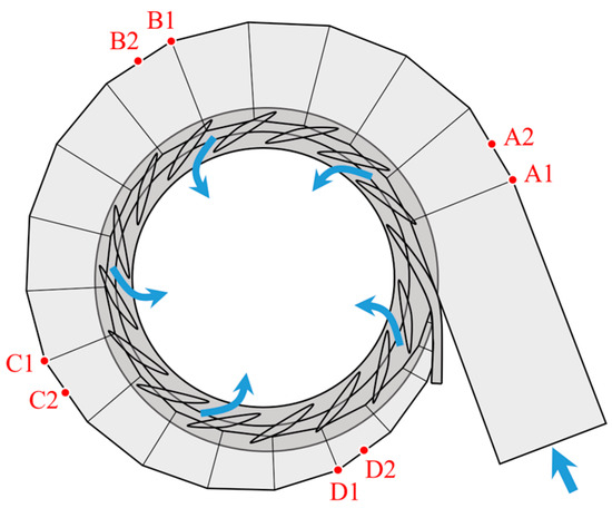 Water flows through the inlet of the spiral case and flows toward the vane region after moving along the equi-angular spiral. Based on velocity matrix calculations, it can be confirmed that the internal water flow is axisymmetric and potential. To analyze the pressure changes in the spiral case during load rejection, several pressure-monitoring points are set along the axis line of the spiral case, as shown in Figure 5. The structural responses at the sections and between sections are possibly different due to the structural shape. Pressure-monitoring points (A1, B1, C1, D1) are located in the section, and pressure-monitoring points (A2, B2, C2, D2) are distributed between the sections along the axis of the spiral case.