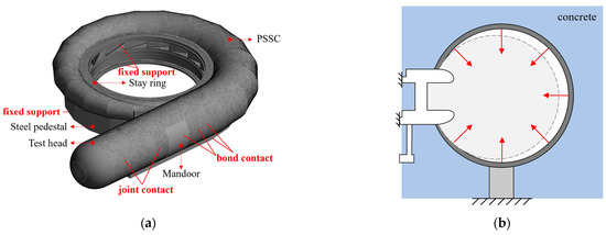 Based on the isentropic spiral line theory, the asymmetrical design of the PSSC is intended to ensure the internal axisymmetric potential flow during operation, reducing energy dissipation caused by swirling and vortexing. The combined effect of the asymmetrical shape of the PSSC, internal hydraulic pressure and unbalanced hydraulic force leads to horizontal deflection, resulting in an asymmetric distribution of contact states. The preloading clearance can be reflected by the contact state between the PSSC and the concrete, which has an impact on the load transmission mechanism and, in turn, causes symmetric and asymmetric characteristics of deformation and stress distributions. It has been proven that the deformation and stress responses of the PSSC can be affected by preloading pressures [21,22,23]. As for lower preloading pressures that underutilize the tensile strength of the PSSC, additional steel bars may be necessary to prevent concrete cracking. Excessive preloading pressure with a large initial preloading clearance is likely to cause stress concentration and excessive vibration in the structures, especially under low-head operating conditions. However, the recommended range for preloading pressure values remains broad in engineering practice and relevant codes, typically ranging from 50% to 100% of the maximum static head [24].