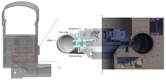 Based on the results of the CFD and preloading spiral case models, a pump-turbine and plant concrete structural model was established for the FSI analysis of load rejection. Figure 7 shows that the model is composed of the deformed PSSC (with mandoor), stay ring, headcover, bottom ring and plant concrete, where the deformed PSSC is obtained from the preloading spiral case model.