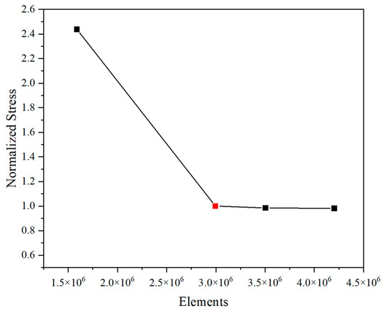 To balance the calculation time and accuracy, four sets of meshes for the structural model were established for the mesh independence analysis. The structural model is mainly meshed by tetrahedral mesh elements. To achieve better grid quality, the PSSC and stay ring are bolted together as a single structure. It can be seen that an insufficient mesh density can lead to stress singularities, so the mesh is refined at the typical stress concentration locations, including the contact region and the rounded corners of the stay vanes. Also, a two-layer grid is set on the spiral case in the radial direction considering the difference between the internal and external transmission of hydraulic pressure. Figure 8 shows that once the mesh element number reaches 2.996 × 106, the calculation result of normalized stress no longer shows significant changes with further increases in mesh refinement. As a result, it is concluded that this mesh setting can be used for further finite element calculations of the FSI model.