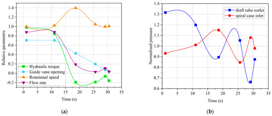 The normalized values and 6 key time points during load rejection. (a) Relative parameters; (b) normalized pressure.