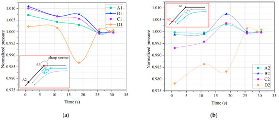 Pressure changes at the monitoring points. (a) At sections; (b) between sections.