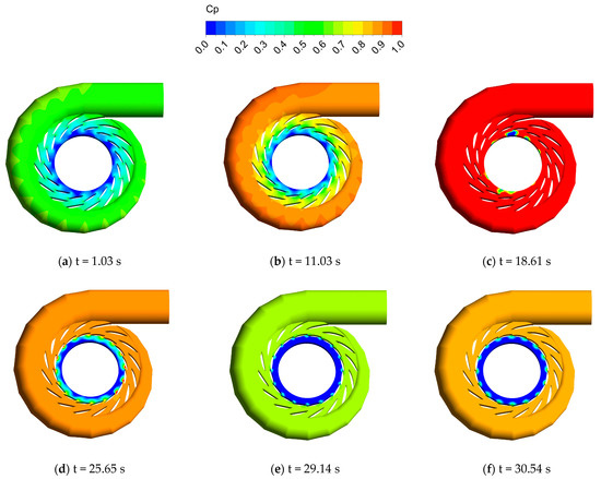 The relative pressure distributions of the flow passage during load rejection are shown in Figure 12, where they initially increase and then decrease. From t = 1.03 s to t = 11.03 s, the pressure gradient within the spiral case domain is considerable. Due to the rotor–stator interaction between the vane region and the runner with long and short blades, the pressure distribution within the spiral case decreases progressively from the inner to the outer edge, with high pressure concentrated between sections.