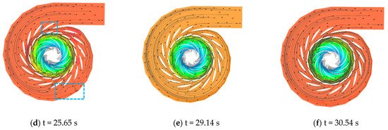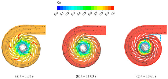 The streamline and relative pressure distribution of the cross-section (z = 0) during load rejection are shown in Figure 13. At the initial stage, when t = 1.03 s and t = 11.03 s, the water flows smoothly through the straight-pipe section of the spiral case, with the spiral flow converging on the outer side of the elbow section. High-speed streamlines concentrate near the wall. The flow aligns well with the logarithmic spiral lines of the spiral case domain, which exhibits an axially symmetric flow characteristic without vortices as it enters the vane region.
