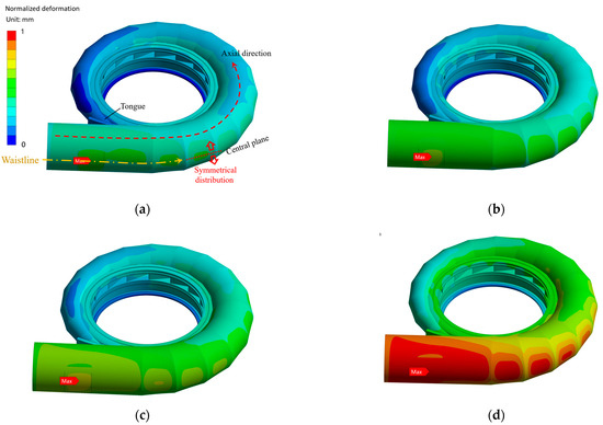 The total deformation distribution of the PSSC under different preloading pressures: (a) 3.20 MPa; (b) 3.91 MPa; (c) 4.56 MPa; (d) 6.52 MPa.