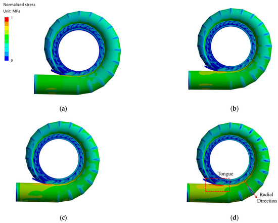 The PSSC with higher preloading pressure shows greater stress in the front half. The maximum flow-induced stresses are located at the inner edge near the tongue. The design of the PSSC under the four selected preloading pressures is confirmed to be safe during load rejection. Under lower preloading pressures (3.20 MPa, 3.91 MPa and 4.56 MPa), the maximum stress is strongly correlated with pressure at the monitoring points (A2, B2 and C2) in the flow domain, and the peak occurs at t = 18.61 s. As the preloading pressure reaches the maximum static head (6.52 MPa), there is a great difference such that the peak value of stress shifts to a later time, t = 25.65 s, with a higher amplitude of about 0.85–1.42 times the normalized value.