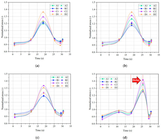 Von Mises stress changes at the monitoring points under different preloading pressures: (a) 3.20 MPa; (b) 3.91 MPa; (c) 4.56 MPa; (d) 6.52 MPa.