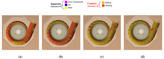 To further investigate the reasons for differences in stress variation under different preloading pressures, the impact of preloading clearance on the structural characteristics of the PSSC during load rejection will be analyzed from the perspective of the contact status. Since the normalized stress curves in Figure 15 show significant differences at t = 18.61 s and t = 25.65 s, the contact status between the PSSC and concrete under different preloading pressures at these two moments is shown in Figure 17 and Figure 18. The regions colored orange and red indicate contact between the two, while yellow, blue and pink represent no contact.