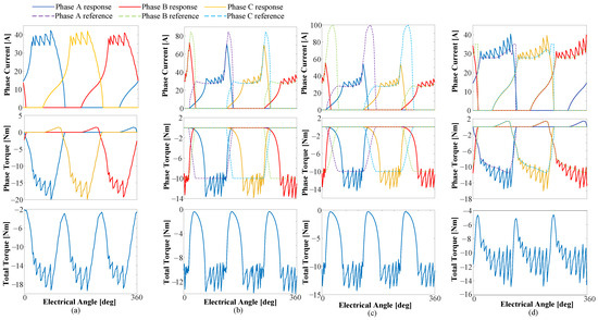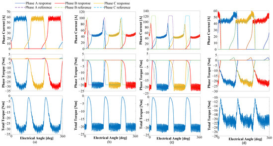 Figure 7d. The turn-on angle is 138.51° and turn-off angle is 314.27°. The proposed TSF yields an average torque of −19.55 Nm with a reduced torque ripple of 3.11 Nm and a phase RMS current of 28.81 A. There is lower reference current tracking error in the magnetization region, and the phase current reaches the peak reference current in the demagnetization region. Hence, a better torque ripple performance is achieved with the proposed TSF at a similar RMS phase current compared to the average torque control.