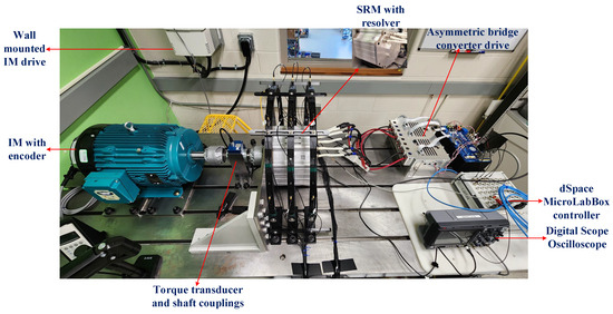Figure 9 shows the experimental setup consisting of the 12/8 SRM, an IM dynamometer operated in speed control mode, and the dSpace MicroLabBox controller. The SRM asymmetric bridge converter drive consists of the F4-250R17MP4 IGBT module made by Infineon. In order to perform the experimental correlation, the reference current profiles generated from the simulation are stored as look up tables in the dSpace MicroLabBox controller. Similar to the simulations, the hysteresis current control technique is used to track the reference current. A current sampling frequency of 20 kHz has been used. The DC link voltage has been set at the rated value of 72 V. The average torque and torque ripple are calculated from the estimated torque waveforms using the measured phase currents and rotor position owing to the low bandwidth of the torque transducer. The torque measured by the torque transducer (NCTE Series 3000) is also shown in the results superimposed on the estimated torque waveform.