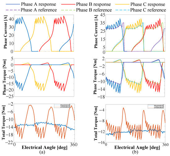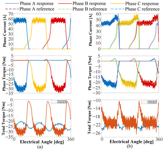 Figure 7b. The turn-on angle is 193.67° and overlap angle is 14.35°. A large tracking error can be seen between the reference current and actual phase current. An average torque of −16.11 Nm is achieved with an RMS torque ripple of 7.96 Nm. The phase RMS current is 27.06 A. The results for the cubic TSF are shown in