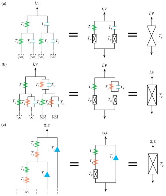 In studying the aforementioned issues, we found that as the symmetry of the functional fractal tree evolves in the physical fractal space, the properties of the fractal operators become more enriched, as shown in Figure 1. Specifically, Figure 1a represents the abstract process of fractal cells in nerve fibers, forming a resistance-capacitance network with an infinitely expanding tree-like topology that is structurally perfectly symmetrical [2]. Figure 1b represents the abstract process of fractal cells in neuronal dendrites. Its assembly of components is consistent with that of nerve fibers, and it maintains a macroscopic binary bifurcation structure [2]. However, at this point, due to the introduction of an additional physical component, the functional fractal tree undergoes its first symmetry breaking. This phenomenon is caused by the unequal number of physical components at the two ends of the bifurcation. Physiologically, this multi-scale fractal tree model of dendrites can also be used to explain the electrophysiological changes associated with aging and neurodegenerative diseases [4,5]. If the topological structure of the functional fractal tree and the number of the physical components at the two ends of the bifurcation are changed simultaneously, a second symmetry breaking will occur, forming a new fractal step topology. Figure 1c represents the abstract process of fractal cells in compact bone fibers [6]; this soft/hard alternating multi-level self-assembly pattern is not unique to bone and is widely found in biological materials such as shell [7] and nacre [8]. In our study of the operator algebra method for viscoelastic theory, we found that fractal tree and fractal step operators share commonalities: both are quadratic radical operators, or in other words, both are non-rational operators. There are also differences: the fractal tree operator is extremely simple, while the fractal step operator is quite complex. The simplicity of the former comes from the symmetry of the fractal tree topology, while the complexity of the latter arises from the symmetry breaking of the fractal step topology. It is important to note that the methods for breaking symmetry are not unique. Figure 1b achieves symmetry breaking by changing the number of physical components at the two ends of the functional fractal tree. If the number of physical components is not changed, but only their functional properties are altered, symmetry breaking can also be achieved. Therefore, if the topological structure of the functional fractal tree and the functional properties of the physical components at the two ends of the bifurcation are changed simultaneously, the fractal step topology shown in Figure 1c can also be formed. We found that as the number and degree of symmetry breaking increase, the properties of the fractal operators become more enriched. For a perfectly symmetrical functional fractal tree (Figure 1a), it is difficult to characterize the various mechanical properties of complex organisms, such as the high modulus and toughness of bone [9,10,11,12,13], with just two types of physical components and the classical spring-dashpot model. The introduction of symmetry breaking increases the designability of fractal operators, enriches their basic functions, and broadens the applicability of the physical fractal space.
