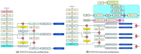 The YOLOv5 and YOLOv8 algorithms represent two classic members of the YOLO family of algorithms, whose network architecture is illustrated in Figure 1. The YOLOv5 algorithm is characterized by high processing speed and a compact model. The YOLOv8 algorithm incorporates a number of enhancements over the YOLOv5 algorithm, with the objective of improving accuracy. YOLOv8 represents the latest iteration of the YOLO family of object detection algorithms. The algorithm is employed in a variety of applications, including image classification, object detection, and instance segmentation. It incorporates novel features that enhance the performance and flexibility of the model. It is regarded as one of the most effective options for tasks such as object detection, image segmentation, and pose estimation. YOLOv8 offers new state-of-the-art (SOTA) models, including the P5 640 and P6 1280 resolution networks for object detection, as well as a YOLACT-based instance segmentation model. Furthermore, YOLOv8 offers models based on diverse scaling factors, including YOLOv8s, YOLOv8n, YOLOv8l, and YOLOv8x, thereby catering to a variety of requirements.