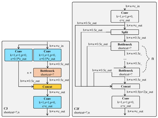 The YOLOv8 model has undergone a significant number of optimizations and improvements from the YOLOv5 network structure. Backbone: YOLOv8 replaces the C3 module in YOLOv5 with the C2f module for further lightweighting. Figure 2 illustrates the difference between C3 and C2f modules.The SPPF module in YOLOv5 is followed, and the model is carefully fine-tuned for different scales, resulting in a substantial improvement in model performance, as shown in Figure 2. The kernel size of the initial convolutional layer is modified from to . All C3 modules have been replaced with C2f modules, which feature additional layer-hopping connections and split operations. The number of blocks has been modified from 3-6-9-3 in C3 modules to 3-6-6-3 in C2f modules. The number of channels in the input tensor of each bottleneck in C2f is halved from the previous level, resulting in notably less computation, and an increase in gradient flow can enhance the convergence speed and effect. The C2f module initially processes the input tensor through the Conv1 layer for splitting, dividing it into two parts, . One part directly passes through the n bottleneck, while the other undergoes a series of operations, ultimately outputting through the Conv2 layer convolution. The input tensor, with subscripts , is split into two parts, with one passing directly through the n bottleneck, and the other undergoing a shortcut operation with a size of . This process continues through each operation layer, ultimately resulting in output through the Conv2 layer. This is equivalent to an shortcut (the branch tensor of the initial Conv1 layer and the tensor resulting from splitting are both bottlenecks).