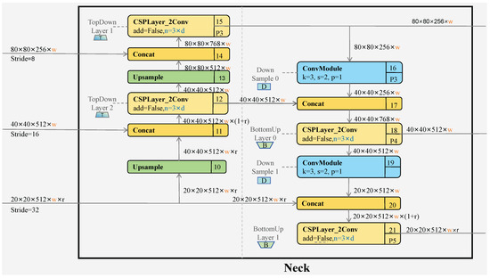 Neck: The concept of PAN is utilized, the structure of which is based on downsampling from the bottom–up. YOLOv8 eliminates the downsampling layer, as illustrated in Figure 3. Subsequently, the width and height are downsampled 32 times following the final SPPF module of the backbone (Layer 9). This is equivalent to layers 4 and 6 being downsampled 8 and 16 times, respectively. The input image resolution is 640 by 640 pixels, and the resolutions of layers 4, 6, and 9 are 80 by 80 pixels, 40 by 40 pixels, and 20 by 20 pixels, respectively. These layers are used as inputs to the PANet structure, which is upsampled, and channel-fused, and the three output branches of PANet are fed into the Detect head for loss calculation or result-solving. In contrast to FPN (unidirectional, top–down), PANet is a bidirectional pathway network that incorporates bottom–up paths, facilitating the transfer of information from the bottom layer to the top layer.