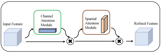 The Convolutional Block Attention Module (CBAM) is an attention mechanism that combines channel and spatial attention, thereby enhancing the performance of convolutional neural networks [29]. The Channel Attention Module distinguishes between the features present in different channels by calculating the relative importance of each channel. The spatial attention module determines the spatial importance of each pixel, facilitating the capture of the spatial structure of the image. CBAM comprises a Channel Attention Module (CAM) and Spatial Attention Module (SAM), which, respectively, perform channel and spatial attention. This reduces the number of required parameters and computational resources and allows for seamless integration into existing network architectures as a plug-and-play module, as illustrated in Figure 6.