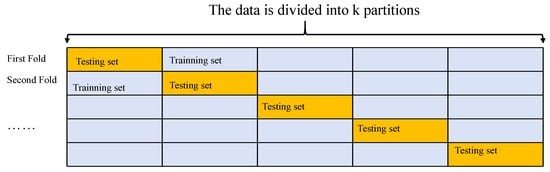 K-fold cross-validation (K-fold) [32] is frequently used to assess machine learning models on training data. The original dataset is divided into K subsets, which are referred to as “folds”. The model is trained and validated on K occasions, each time utilizing a distinct training set. In each iteration, one fold is designated as the validation set, and the remaining K-1 folds constitute the training set. This yields K models and their corresponding validation scores. The methodology of K-fold cross-validation is illustrated in Figure 11.
