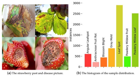 The dataset pertaining to strawberry pests and diseases is illustrated in Figure 12. Figure 12a is a picture of strawberry pests and diseases, while Figure 12b shows a histogram of the sample distribution, including a total of seven identified pest and disease types.