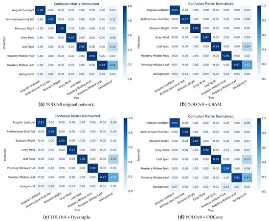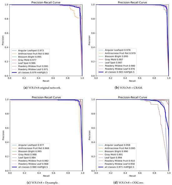 In Table 5, YOLOv8 + Dysample exhibits the highest F1 score, while YOLOv8 + CBAM has the highest @0.5. These two enhancements demonstrate superior performance compared with several other attention mechanisms and are more suitable for strawberry pest and disease detection. The confusion matrices for the four models are presented in Figure 14, showing superior performance for all seven pests and diseases in the dataset. In Figure 15, the precision–recall curve is plotted in such a way that a model with a curve that is closer to the upper-right corner demonstrates superior performance, indicating higher recall while maintaining higher precision. To evaluate the performance of different models, the AUC can be applied as a metric. A higher AUC value indicates a more effective model. AUC values greater than 1 indicate superior performance. Figure 15 illustrates the precision–recall curves of the four models, where the YOLOv8 + CBAM and YOLOv8 + Dysample models have the greatest horizontal and vertical area under the curve, indicating superior detection accuracy and completeness across all detection categories. The results of Models 1 and 4 are somewhat inferior. In particular, the identification of Powdery Mildew Fruit and Anthracnose Fruit Rot samples is less accurate than that of Models 2 and 3.