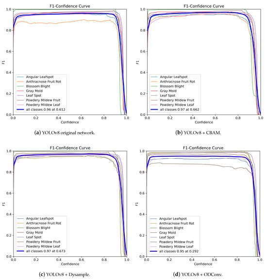 In comparative analysis, YOLOv8 exhibited superior performance to YOLOv5 in terms of precision, recall, F1, and . Additionally, the inference speed of YOLOv8-s was observed to be greater than that of other models within the YOLOv8 family due to its reduced number of parameters and lower computational complexity. To more effectively address the need for real-time detection of strawberry diseases, the YOLOv8-s network is being optimized for enhanced performance. Experiments were conducted to determine the impact of various improvement methods on the training results, where CBAM, DySample, and ODConv improvements were incorporated into the YOLOv8 network structure. These enhancements facilitated an improvement in feature representation, the capture of contextual information, and the enhanced performance of the YOLOv8 object recognition model. The results of the comparison experiments of the four models are presented in Table 5.