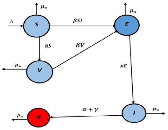 We will use functional analysis techniques and fixed point theory for existence theory and stability analysis. Lagrange’s interpolation technique will serve as the foundation for the numerical method used to build the approximate solution. The Figure 1 provides a description of the previously discussed model Equation (3).