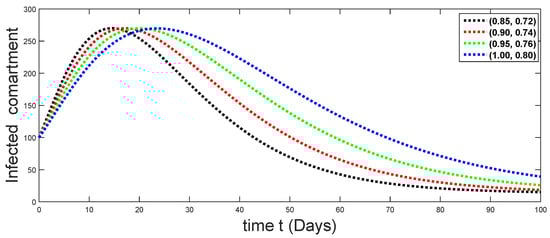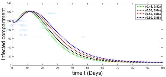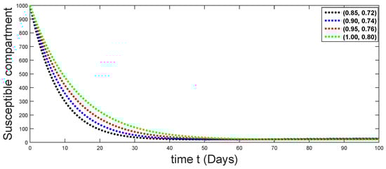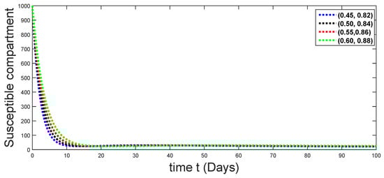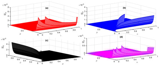 It has been shown that the disease-free equilibrium point of the proposed model is asymptotically stable if and unstable if . Since the basic reproduction number indicates how many secondary infections, under typical behavioural patterns, an infected individual should cause in a population of hosts that are fully susceptible. Thus, is a constant that accurately characterizes the initial phases of an epidemic brought on by a new virus. The values of depends upon the parameter values. If , it shows that the infection is going to decrease and the equilibrium of the disease-free type will be locally asymptotically stable. But if , it shows an increase in infection in society. Hence, the value of plays an important role in investigating such dynamical behaviour of the transmission of disease in a community. Against different values of parameters, we see that , as shown in Figure 2. In Figure 2a, we observe that as decreases and decreases, the reproduction number increases but never exceeds 1. In the same way, in Figure 2b, as , and decrease, the value of increases but does not exceed 1. In addition, with the decrease in and in Figure 2c, the value of never exceeds 1. From Figure 2d, as we see that and decrease, the reproductive number values do not exceed 1. The different colors represent the difference between density plots of against different values of the given parameters.