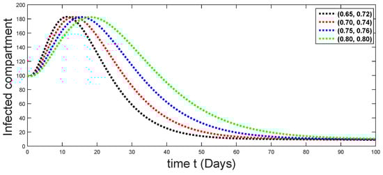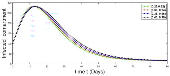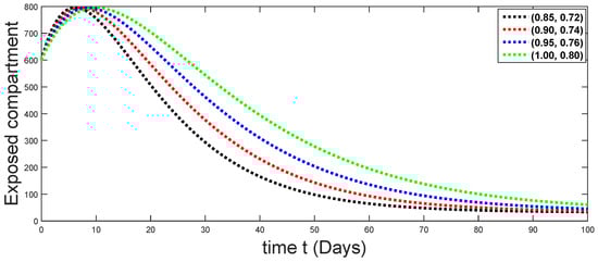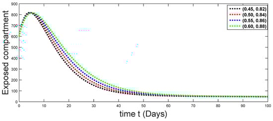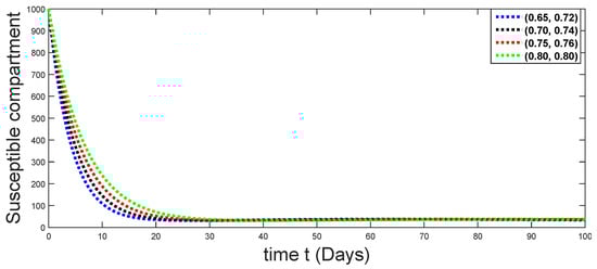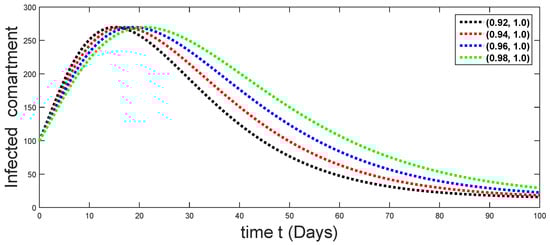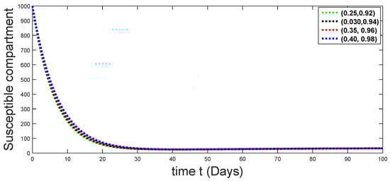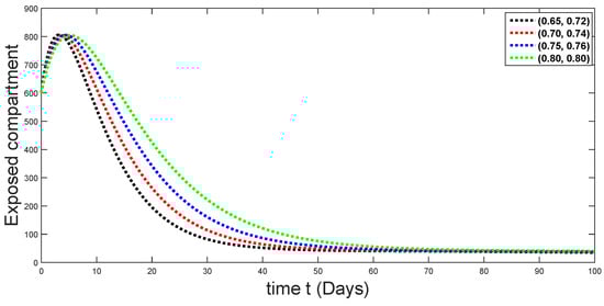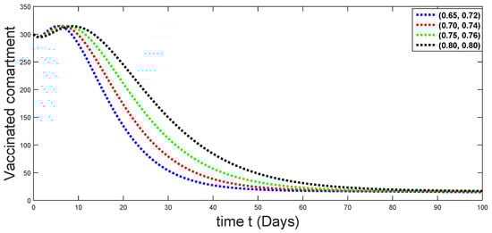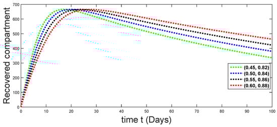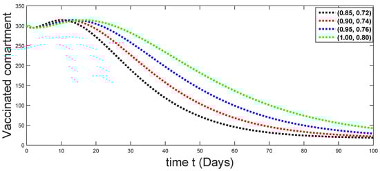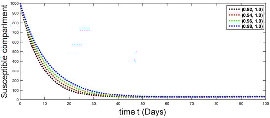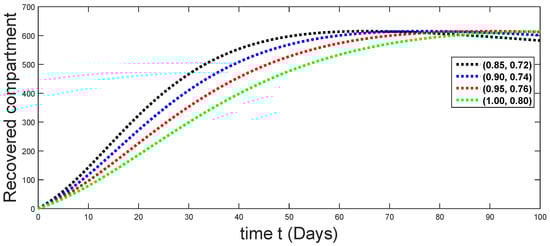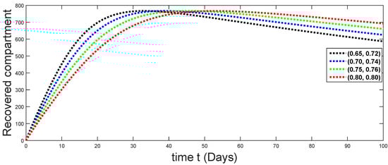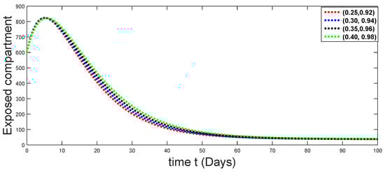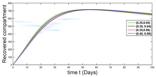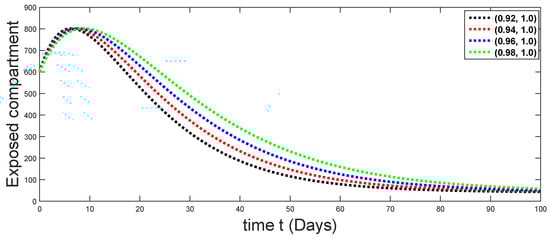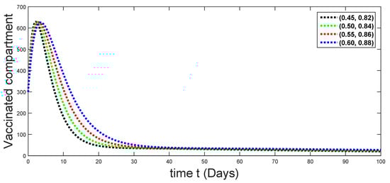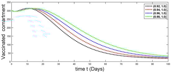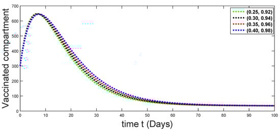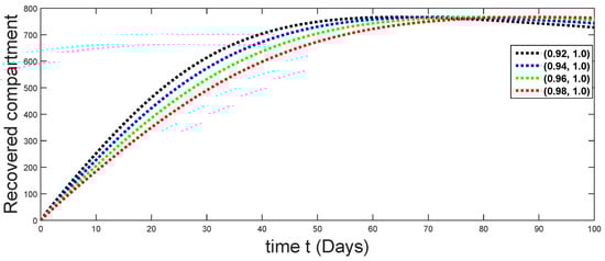 From Figure 3, Figure 4, Figure 5, Figure 6 and Figure 7, we see that as the population of the susceptible class decreases with different fractal fractional orders values, the number of vaccinated individuals consequently increases for some time, and afterwards it decreases. Also, the number of susceptible individuals decreases due to the fact that they are exposed to infection, and hence infection grows initially. But in the presence of vaccination, the infection goes on to decrease, and hence the population of recovered individuals increases. Here, we should be keep in mind that four different sets of fractal fractional orders have been used to see that effect on the transmission dynamics of fractal fractional orders. In the same way, from Figure 8, Figure 9, Figure 10, Figure 11, Figure 12, Figure 13, Figure 14, Figure 15, Figure 16, Figure 17, Figure 18, Figure 19, Figure 20, Figure 21, Figure 22, Figure 23, Figure 24, Figure 25, Figure 26 and Figure 27, we can observe that the susceptible class grows smaller with time and that various curves start to develop, until it eventually stabilizes. The decay process is faster at lower values of fractal and fractional orders. The vaccination process is grows, then reduces and becomes stable after some time. At the same time, the exposed class population initially increases and then decreases. The infection first increases, but after vaccination and recovery from infection, it continues decreasing. The recovery classes grows smoothly and achieves a stable position. One thing that should be kept in mind is that stability behaviour is asymptotical in all classes. Here, as the fractional order , the curves are neatly approaching the curve at . In the last case, we have considered ; then, the concerned model reduces to a standard fractional order model, for which we have simulated the results at some fractional order values by taking . The dynamical behaviours are almost same as in the previous cases. Here, we see that as fractals order and , the curves in the graphs tend to be close to the solution curves at the integer order of different classes.