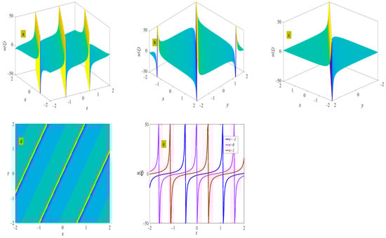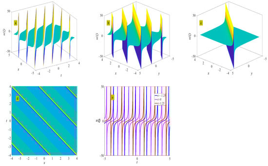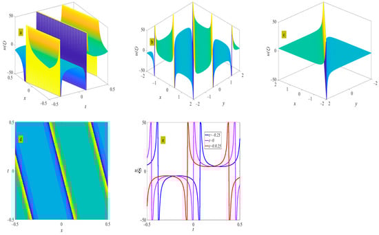 Three-dimensional plot (a), two-dimensional contour plot (d), two-dimensional periodic wave evolution (e) in (x, t) phase space at y = 0 and z = 0, and three-dimensional plot (b) in (x, y) phase space at t = 0 and z = 0 represent the periodic wave of Equation (38) under the conditions of and ; three-dimensional plot (c) in (x, y) phase space represents the solitary wave of Equation (38) under the condition of .