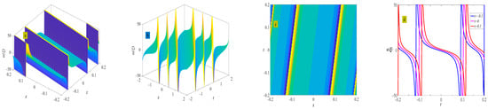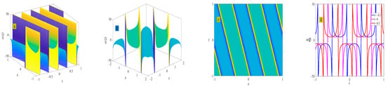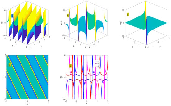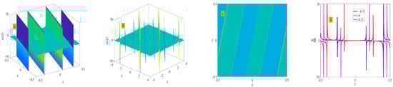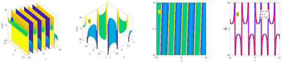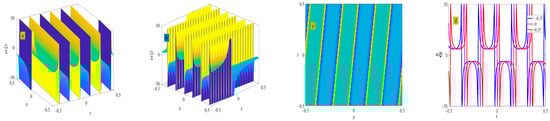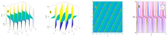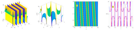 where . Figure 1 shows the evolution of the periodic wave represented by Equation (21), as well as the solitary wave at . This is a periodic wave with singularities in specific spatiotemporal locations, and the amplitude and period of the wave remain unchanged during propagation.