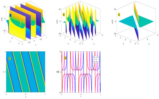 Three-dimensional plot (a), two-dimensional contour plot (d), two-dimensional periodic wave evolution (e) in (x, t) phase space at y = 0 and z = 0, and three-dimensional plot (b) in (x, y) phase space at t = 0 and z = 0 represent the periodic wave of Equation (26) under the conditions of and ; three-dimensional plot (c) in (x, y) phase space represents the anti-kink solitary wave of Equation (26) under the condition of .