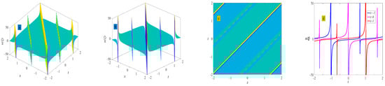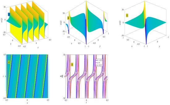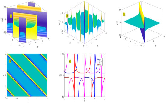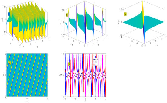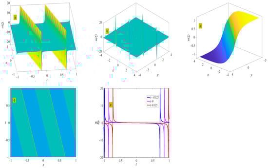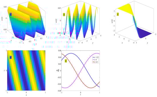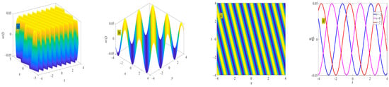 To demonstrate the power and effectiveness of this method, a set of examples will be provided below. If , , , and , according to Equation (9), the solutions of the (3+1)-dimensional mKDV-ZK equation are shown as follows: