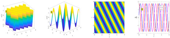 where . Figure 7 shows the evolution of the periodic wave represented by Equation (28), as well as the solitary wave at .