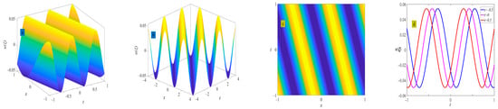 where . The evolution of the periodic wave represented by Equation (43) is shown in Figure 21.