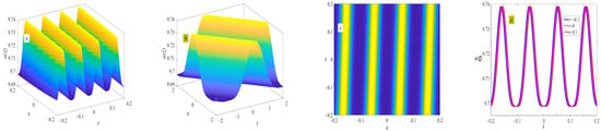 Three-dimensional plot (a), two-dimensional contour plot (d), two-dimensional periodic wave evolution (c) in (x, t) phase space at y = 0 and z = 0, and three-dimensional plot (b) in (x, y) phase space at t = 0 and z = 0 represent the periodic wave of Equation (39) under the conditions of and .