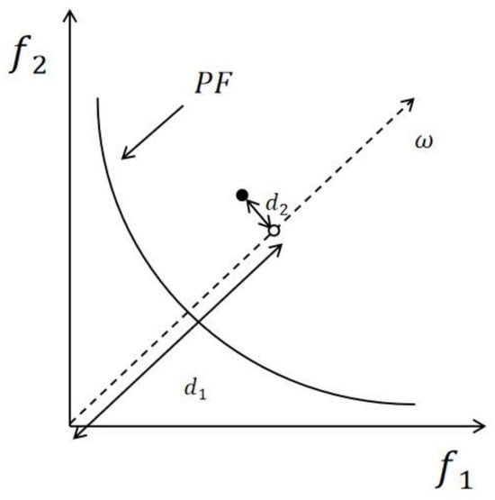 where x is the decision vector, is the reference vector, is the ideal point in the objective space, is penalty factor, is the projection of onto , and is the perpendicular distance from to . The calculations for and are as follows: