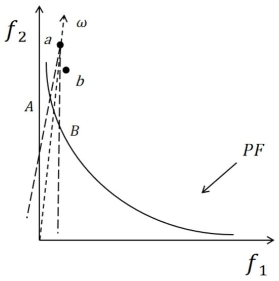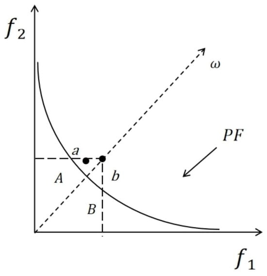 In Figure 2, is a boundary weight vector, and segment is part of the true PF. As seen in Figure 2, for and the associated individuals a and b, it is evident that individual b is closer to the expected PF segment than individual a. However, due to of b being greater than that of a, individual b is not selected. This indicates that an excessive focus on the weight vectors themselves, while neglecting the algorithm’s need for individuals with strong convergence in the early stage, and a blind pursuit of diversity, may impair the algorithm’s convergence performance.
