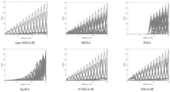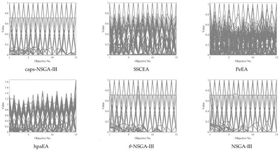 Figure 4 presents the final PFs generated by six algorithms on the 15-objective DTLZ4 instance. As seen in Figure 4, caps-NSGA-III’s overall performance surpasses other algorithms. The diversity performance of -NSGA-III and NSGA-III is slightly inferior. Notably, hpaEA exhibits poor convergence, with the maximum function values for all objectives exceeding 1.