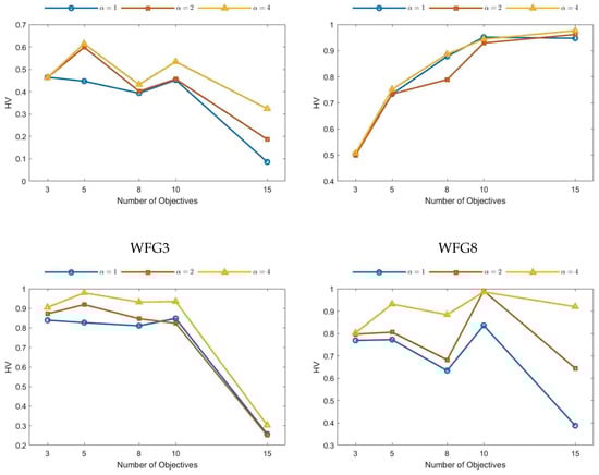 Figure 6 presents the HV line plots for different values of across various types of PF. It can be observed from the figure that different values of indeed affect the performance of caps-NSGA-III. Although performance differences on WFG8 are small, indicating that concave problems may be less influenced by the penalty factor , caps-NSGA-III overall performs best when . On the whole, caps-NSGA-III achieves the best results when , especially on WFG2, where the difference compared to other values is the most significant. This may be because the boundary regions of convex problems are harder to identify, and larger values of can lead to higher values for boundary vectors, thereby helping to maintain diversity.